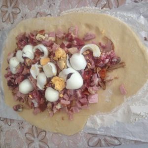6 uova, 1 kg di farina da aggiungere man mano e da usare per lo spianatoio quando si lavora (anche un poco in più eventualmente), 250 grammi di margarina, 50 grammi di burro, più una noce per imburrare la teglia, 150 g. di formaggio grattugiato, un pezzo di lievito da sciogliere in una tazza d’acqua, un cucchiaio d’olio d’oliva e tanto tanto ripieno (salame a dadini, pancetta, mortadella, prosciutto, formaggio di vario tipo tagliato a dadini e quant’altro avete in frigo. ricordate che quello che ci mettete quello ci trovate.